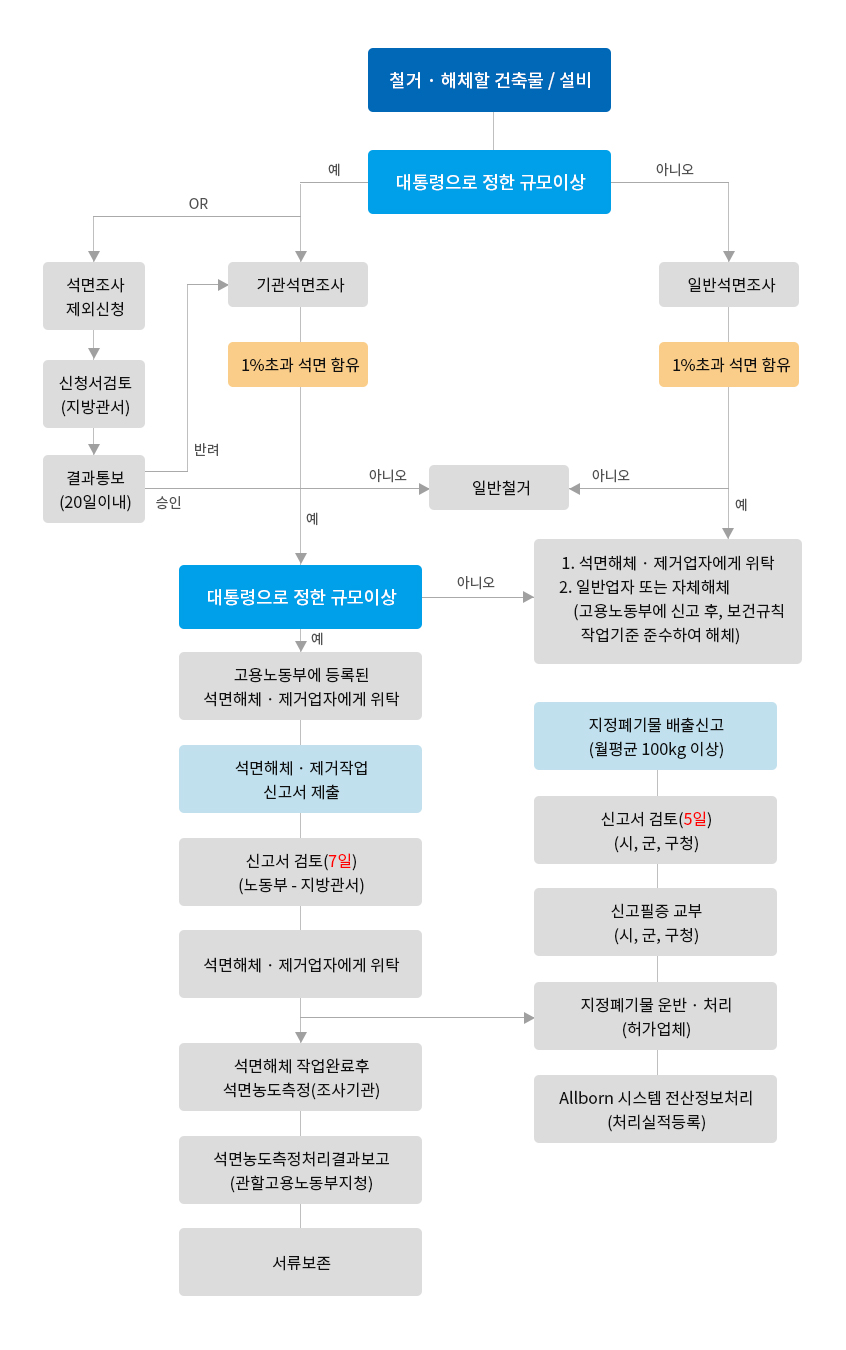 석면에 함유된 건축물이나 설비를 철거하거나 해체하는 자는 고용노동부령으로 정하는 석면해체 · 제거 작업기준을 준수하여야 합니다.(산업안전보건법 제38조의 3)